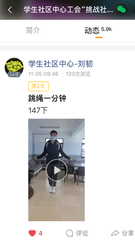 为丰富和活跃职工的业余生活,提高体育竞技的趣味性,提高职工身体素质,凝聚事业发展合力,10月18日?11月5日,学生社区中心举行“挑战社区吉尼斯”活动。前期广泛征集职工意见,考虑到学校疫情防控要求、工作原因不能离岗等特点,此次活动通过“挑战吉尼斯”微信小程序线上打卡形式开展,营造“比学赶超”的活动氛围。